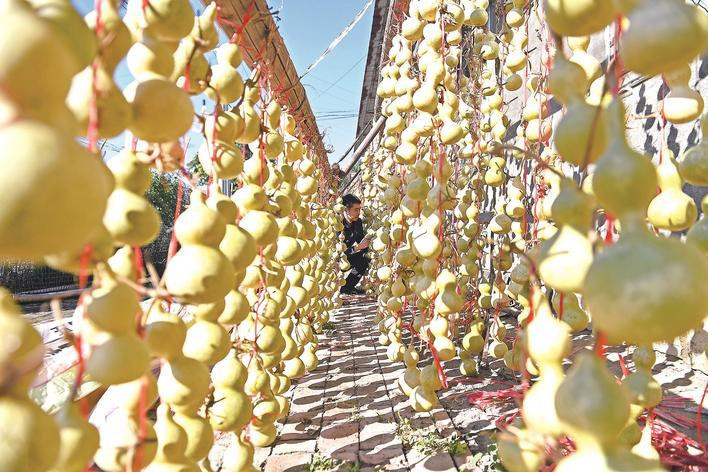 在大城县臧屯镇九间房村葫芦种植基地,农户在晾晒葫芦。刘亮摄